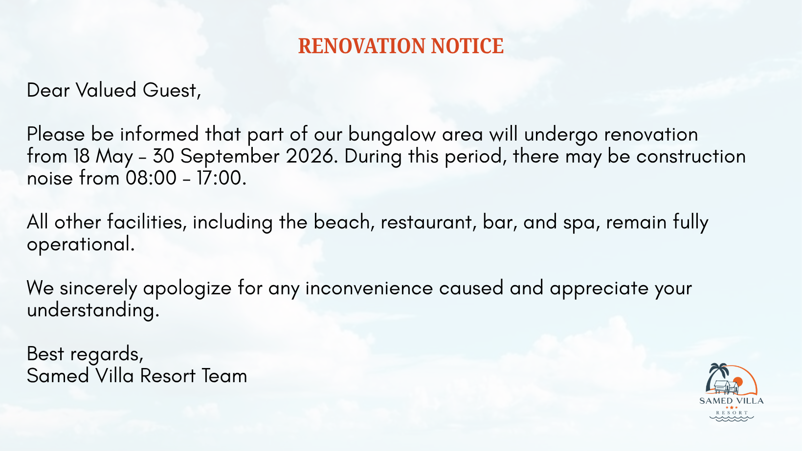 Samed Villa Resort is located on the small beautiful island in the Southeast vicinity of Bangkok (200 km) called Koh Samed, in the area of Rayong district. The island is famous for its magnificent beaches and for the well-known Thai poet, Sunthornpuh, who wrote poetry about this place.